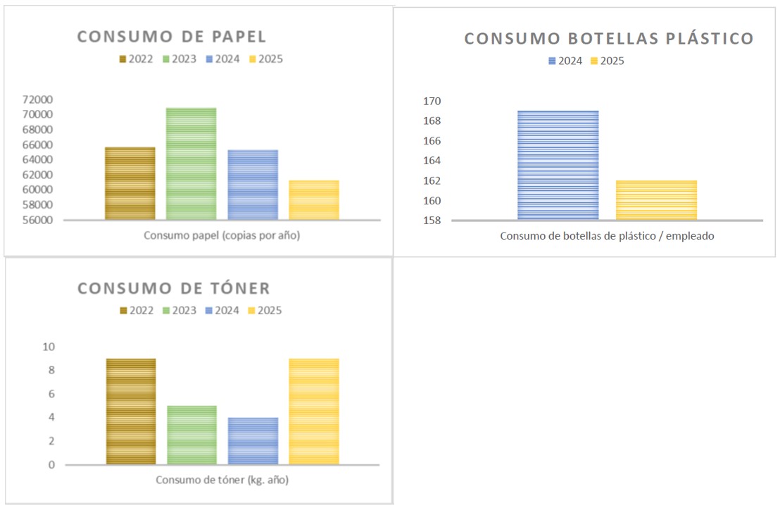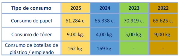 En cuanto a los consumos analizados, tanto el papel como el tóner han experimentado un descenso en este último año, revirtiendo la tendencia de ejercicios anteriores. Asimismo, cabe destacar que en este periodo se ha incorporado un nuevo indicador ambiental: el consumo de botellas de plástico (agua embotellada por empleado). Para este indicador, la compañía dispone ya de registros comparativos entre 2024 y 2025, permitiendo un seguimiento más detallado de la huella de plásticos de un solo uso en la oficina.