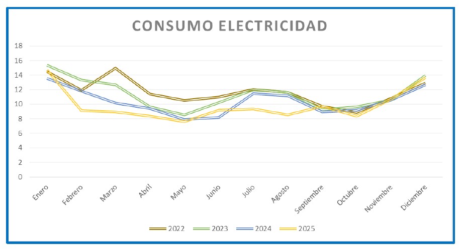 Como se observa en el gráfico, el año 2025 consolida la tendencia de eficiencia energética, registrando los niveles de consumo eléctrico más bajos de toda la serie histórica analizada, situándose sistemáticamente por debajo de los registros de 2022, 2023 y 2024.