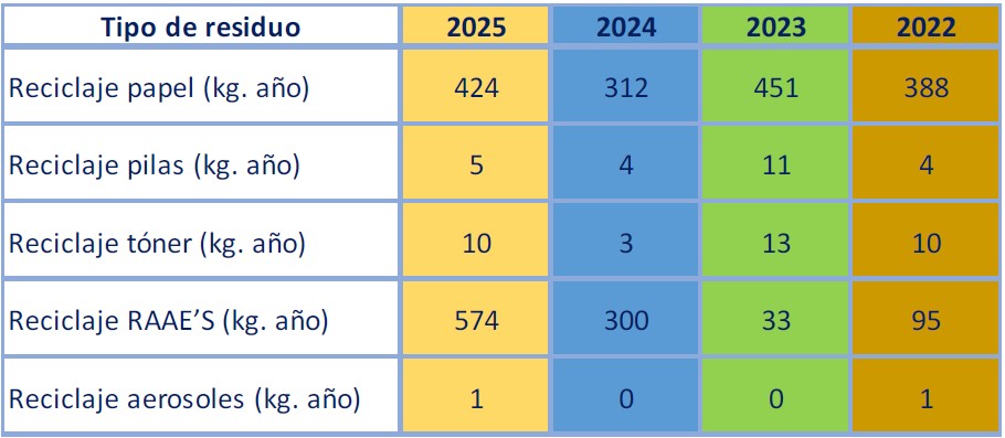 Por otro lado, la empresa analiza como indicadores las cantidades de residuos que se generan y que son enviados a reciclar a través de una empresa autorizada para ello. Los tipos de residuos que se envían para su reciclaje, así como, las cantidades generadas desde 2022, se presentan en la siguiente tabla: